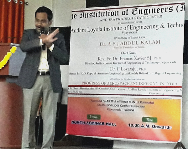 Ms. Deepthi, PG Student of ALIET welcomed the gathering and invited the dignitaries on to the dais. To pay the respect to the Missile Man of India, formally, Lighting the Jyothi and garlanding the portrait of Dr. Kalam was done by the Chief Guest and other dignitaries. Dr. P Kodanda Rama Rao, FIE, Chairman of AP State Center presided over the meeting and briefed briefly about the life & achievements of Dr. Kalam. Simultaneously, he elaborated the activities of IEI in general and the AP State Center of IEI in particular. Rev. Fr. Dr. Francis Xavier SJ, Ph.D., Director, ALIET was the Chief Guest. The speaker of the program was Dr. P Lovaraju, Ph.d., Professor & Head, Dept. of Aerospace Engineering, Lakkireddy Balireddy College of Engineering, Mylavaram